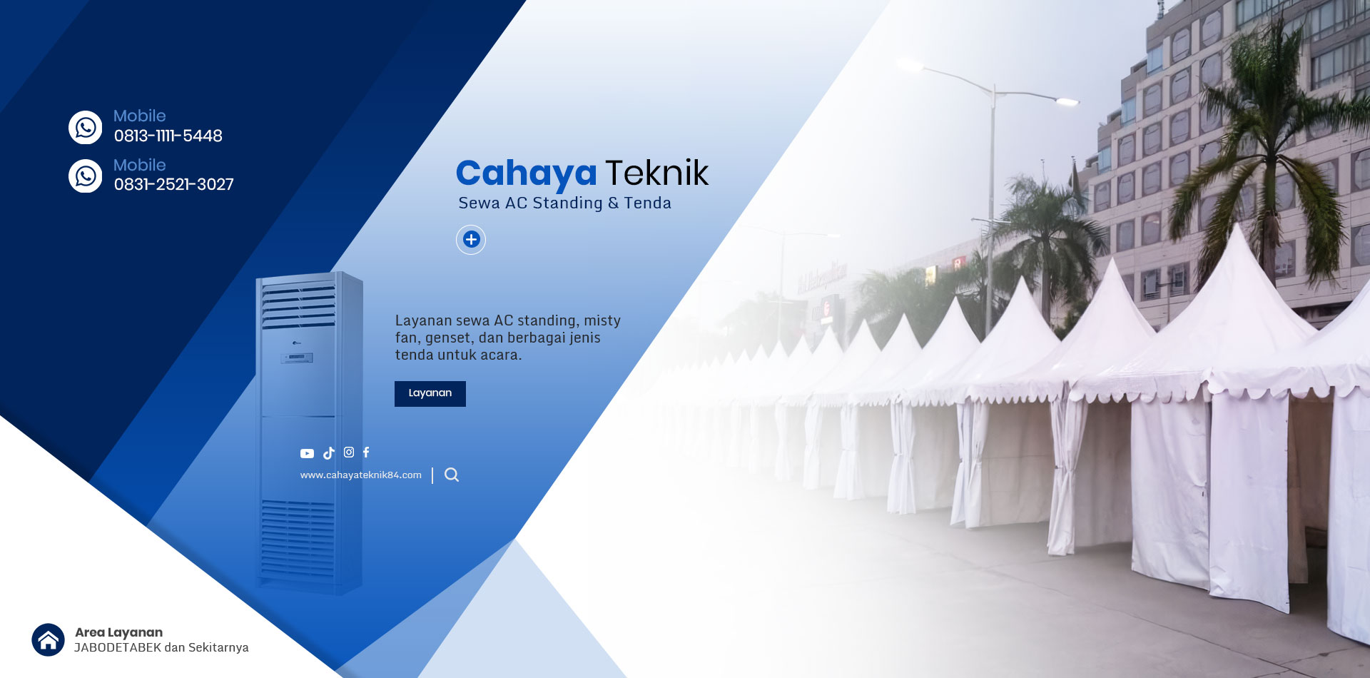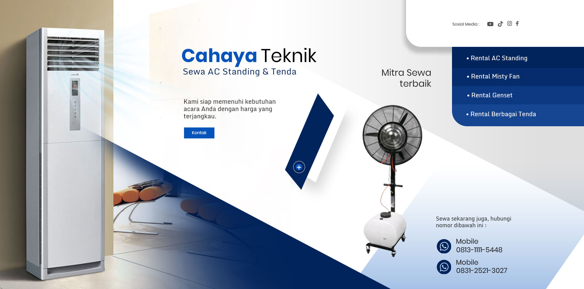 Cahaya Teknik menawarkan jasa sewa atau rental AC standing, genset, misty fan, dan sewa aneka jenis tenda untuk berbagai keperluan seperti tenda roder, tenda sarnafil, dan masih banyak lagi. Dengan keahlian dan pengalaman yang luas, kami dapat menjadi mitra terbaik dan terpercaya bagi pelanggan dalam menyediakan solusi peralatan maupun perlengkapan acara yang dibutuhkan.